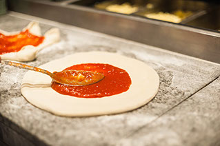 Napoletana (STG) de corazón fino, suave, y húmedo, de bordes altos con alveolado interno, compuesta de ingredientes ligados a la tradición, transformados por nuestros pizzeros aplicando los métodos establecidos en el disciplinar de producción, masa largamente fermentada estirada a mano, tomate pelado campano, queso fior di latte, y cocción rápida en horno artesanal de alta temperatura, todo esto para rendir nuestra pizza perfecta y autentica.